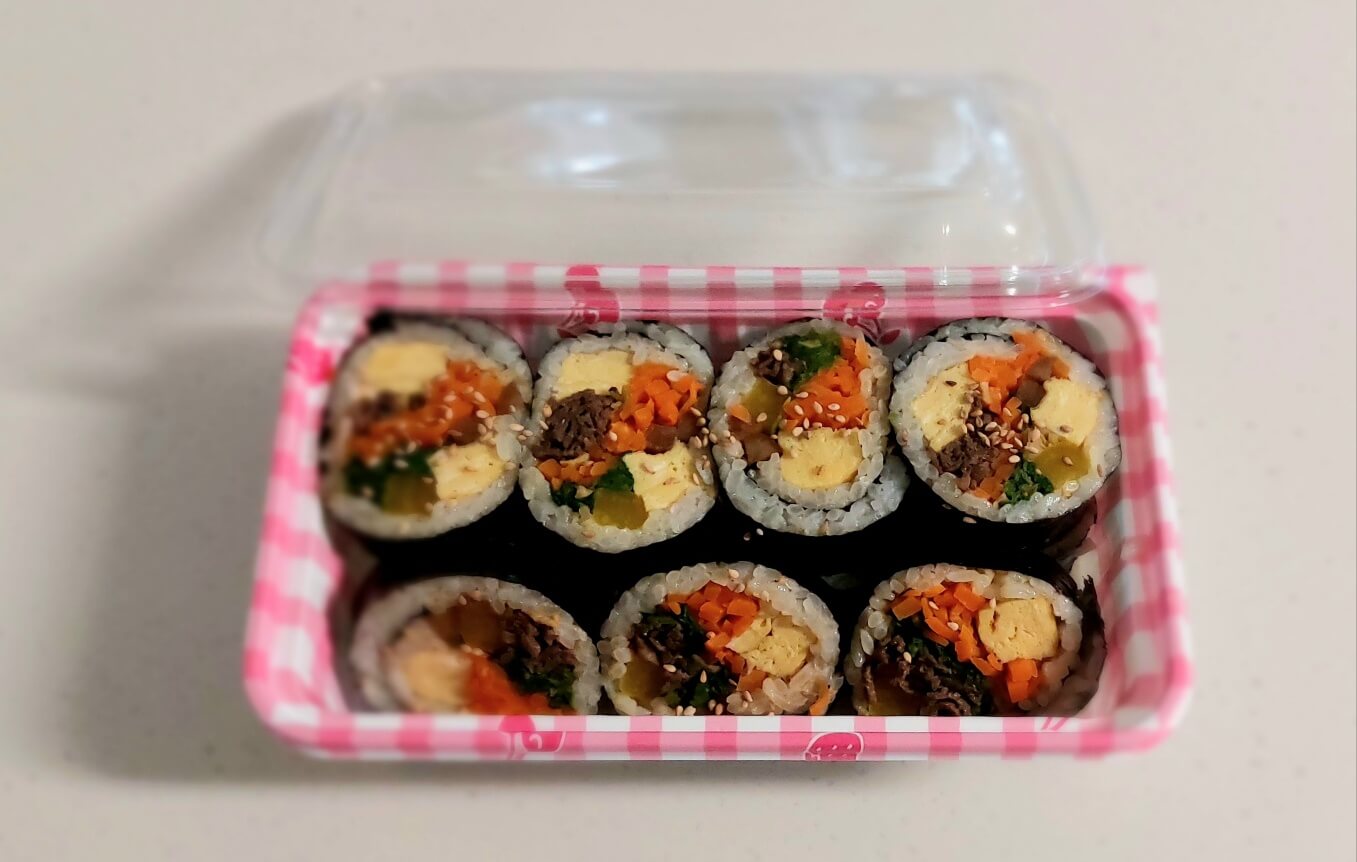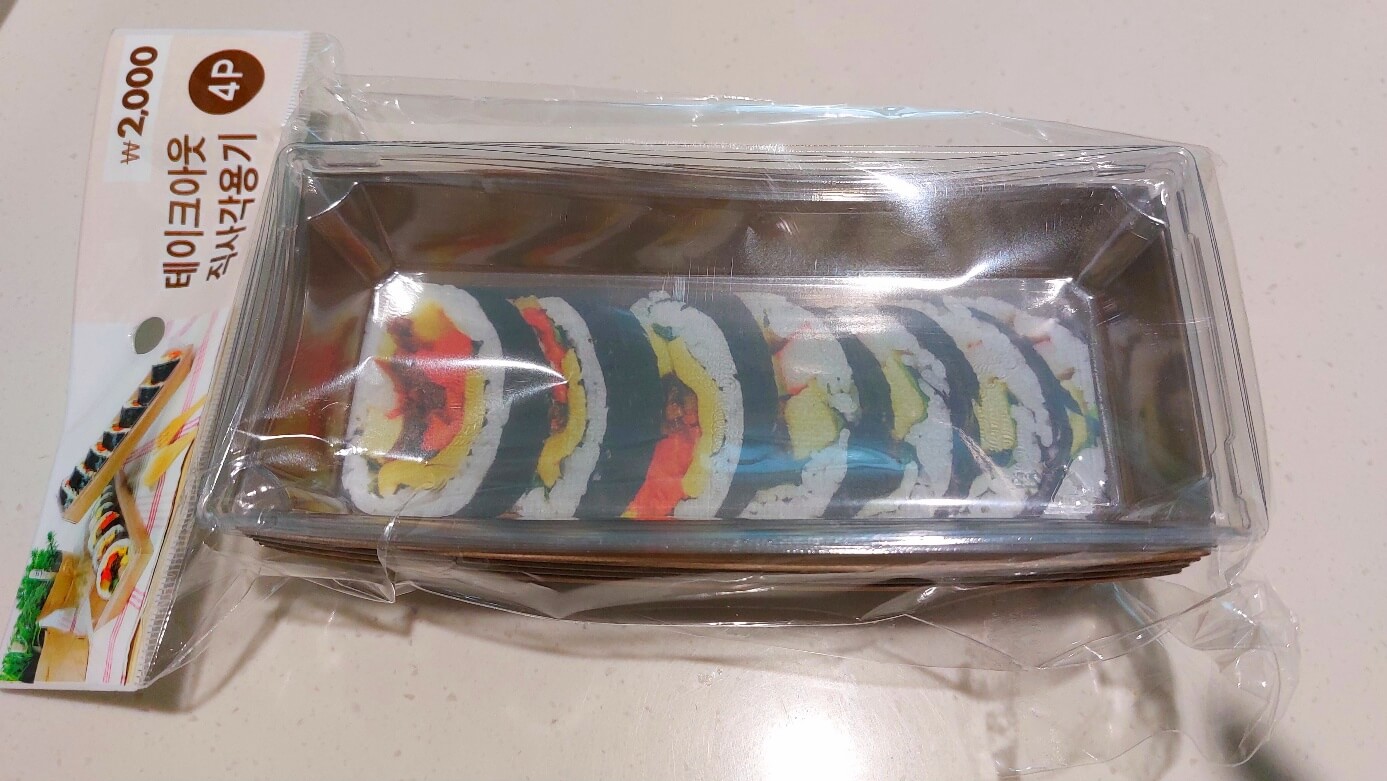 여기에는 김밥 2줄 정도가 들어갈 수 있어요. 주로 단체 행사할 때 많이 사용됩니다. 개인적으로는 이동할 때 음식물을 담고 얇은 고무줄로 한 번 묶어 도시락 형태를 고정합니다.