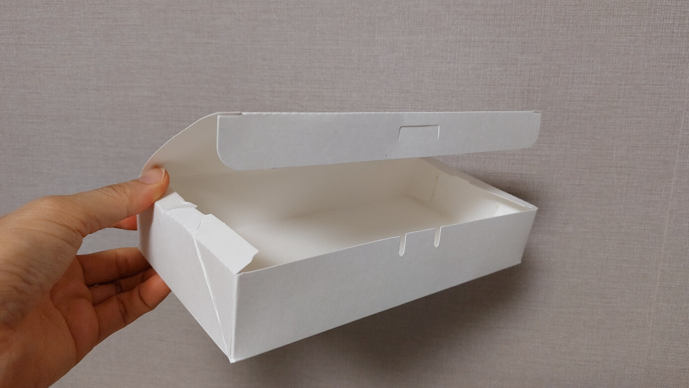 종이도시락은 접어진 형태로 나오는데요. 봉투에서 꺼내어 점선 따라 접으면 간단한 일회용 도시락 용기가 완성됩니다. 주로 김밥이나 만두, 찐빵 집에서 포장할 때 주는 형태입니다. 누구나 자주 볼 수 있어 익숙한 용기이죠?